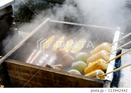 霧島温泉の蒸気蒸しされる野菜とお団子