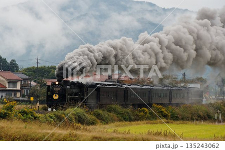 黒煙を上げて田園を駆けるSLやまぐち号