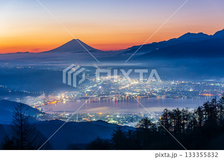 夜明けの高ボッチ高原から諏訪湖の雲海と遠くにそびえる富士山