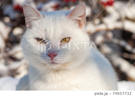 Portrait of a cat outdoors, wearing a knitted scarf, in snowy winter