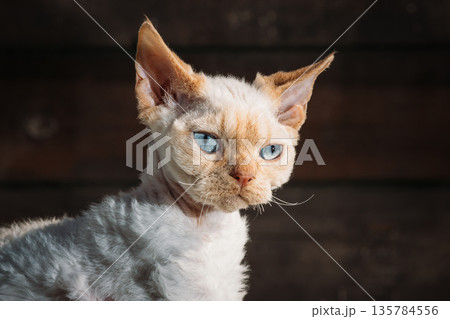 Devon Rex Cat with Blue Eyes Portrait Against Dark Background Studio