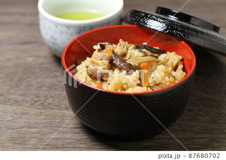 炊き込みご飯、蓋物の器に盛られた五目ご飯とお茶、木目バック