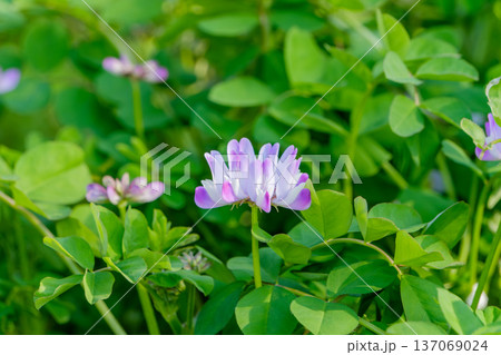田園風景に咲く可憐なピンク色のレンゲソウ