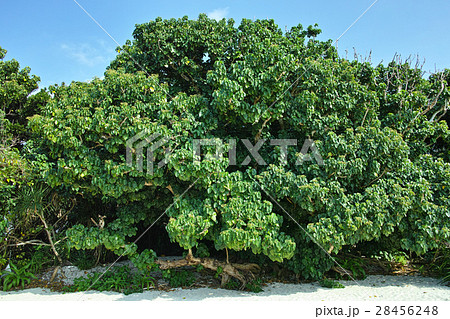 自然 植物 ハスノハギリ、石垣島の海岸にて。真夏のビーチに涼しい木陰を作ります