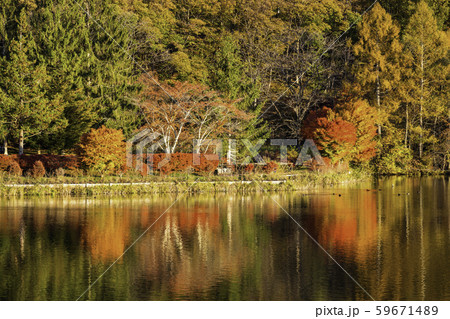 長野県茅野市北山 紅葉の蓼科湖水面の水鏡