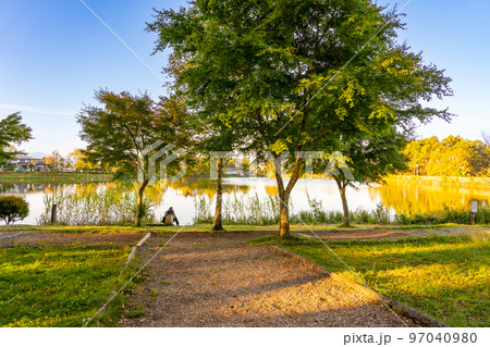 長野県茅野市 紅葉の始まった秋の蓼科湖の朝 湖畔でくつろぐ人