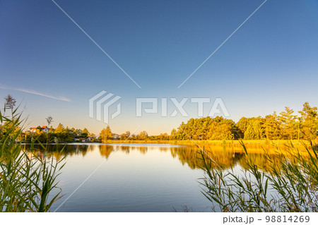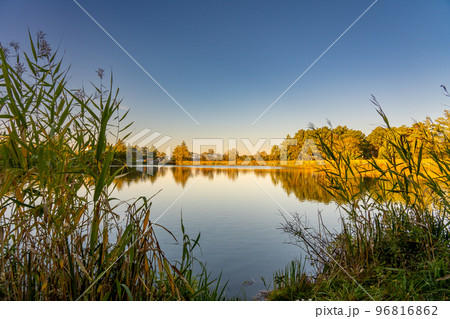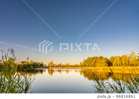 長野県茅野市 紅葉の始まった初秋の蓼科湖の朝