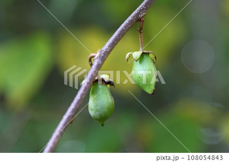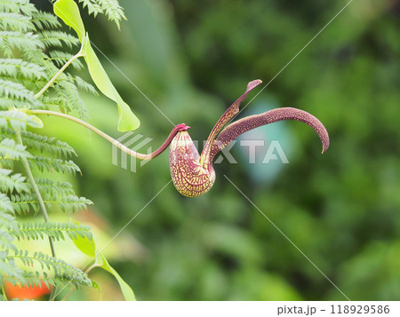捕虫袋がぶら下がる熱帯性食虫植物のウツボカズラ