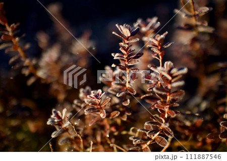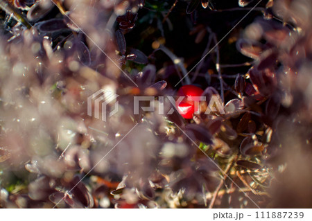 冬色に色付いたクランベリーが霜に覆われ輝く朝
