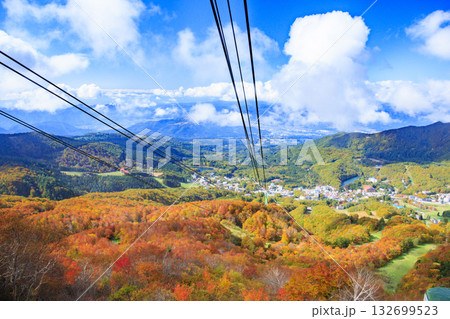 山腹から秋の山々と街並みを見渡す (蔵王温泉スキー場、山形県)