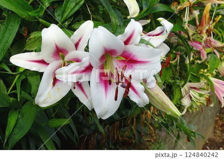 雨に濡れた白地にピンクのユリの花/ニンフ?・7月