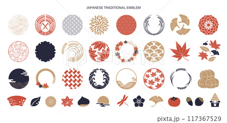 秋の和柄フレームとシンボルとアイコンセット