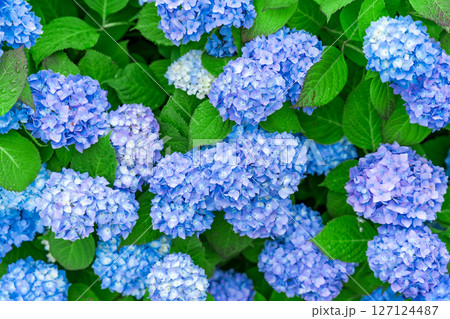 Blue and lilac hydrangea flowers in bloom with green leaves, Bergen, Norway