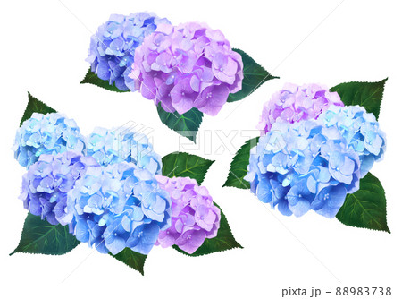 梅雨の時期に咲く美しい薄紫色と水色のあじさいと葉っぱの白バック背景イラスト素材