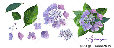 梅雨の時期に咲く美しい薄紫色と水色のあじさいと葉っぱの白バックベクター背景イラスト素材