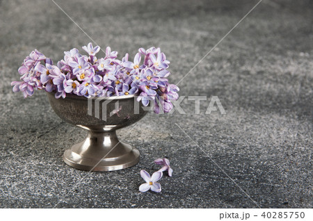 Bunch of lilac in vintage bowl on gray background