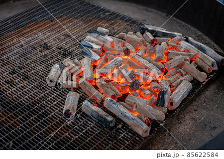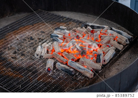 Hot charcoal on big round grill at local food market - close up view