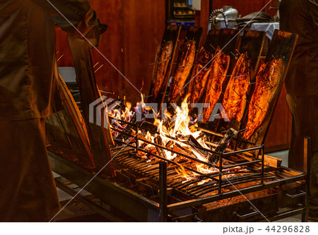 delicious flamed Salmon is smoked on open fire at Christmas market