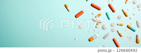 Assorted pharmaceutical pills and capsules in various shapes and colors are spread out on a light blue surface, creating a vibrant and dynamic composition related to medicine and healthcare