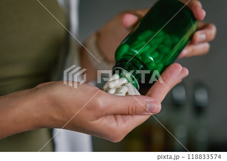 Close-up of woman pouring white capsules from green bottle into hand. Person is taking pills or vitamins. Concept of supplements, medicine or health care
