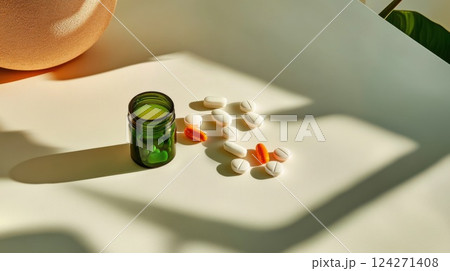 Minimalist flat lay of white pills, orange capsules, and a green vitamin bottle on a clean surface. Modern healthcare, wellness, and pharmaceutical concept