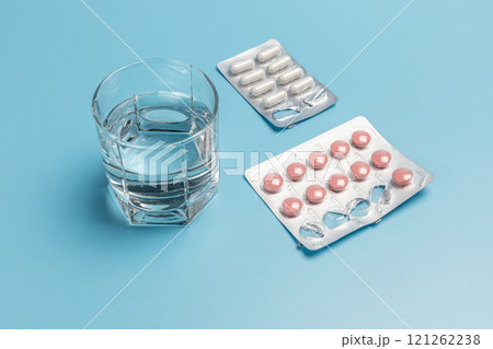 Blister package with Vitamin on color background. Medicine pills on a light background. Medicines and prescription pills flat lay background. blue medical tablets in blister