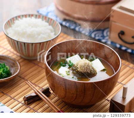 湯気立つとろろ昆布と豆腐のお味噌汁と白ご飯 和朝食・家庭料理・健康的な食卓イメージ