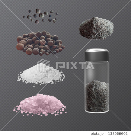 Realistic salt. Edible food seasoning in glass bottle. Himalayan condiment piles and spoons. Grains and powder of sea sodium mineral. Cooking ingredient. Vector 3D culinary spice set
