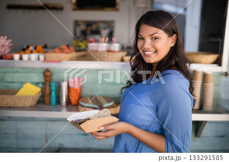 Smiling woman holding tray with tortillas and salad at outdoor food truck counter, copy space