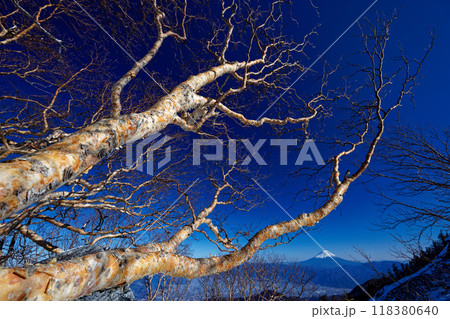 南アルプス鳳凰三山・薬師岳付近のダケカンバ林から見る富士山