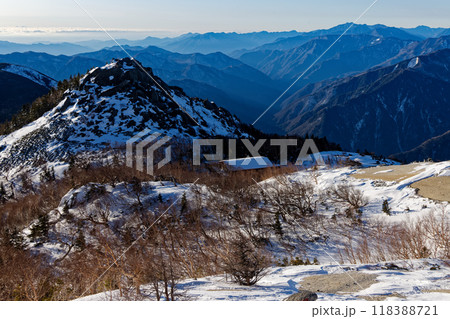 砂払岳から見る冬の鳳凰三山・薬師岳と観音岳