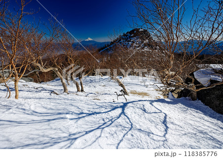 南アルプス・鳳凰山・薬師岳稜線のシュカブラと富士山