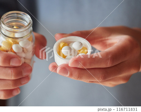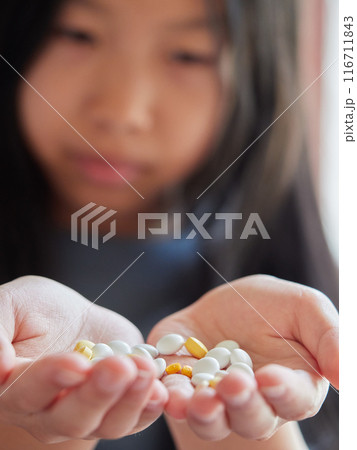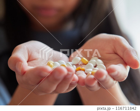 たくさんの各種類の薬品の錠剤の様子と子供の手