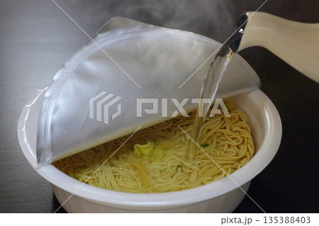 カップ焼きそばに湯を注ぐ
