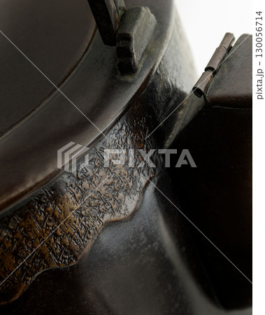 木製の火鉢に置かれたトゲのついた鉄瓶