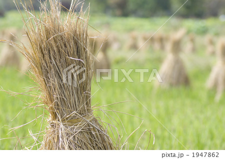 稲刈りの後束ねて天日干しされる藁