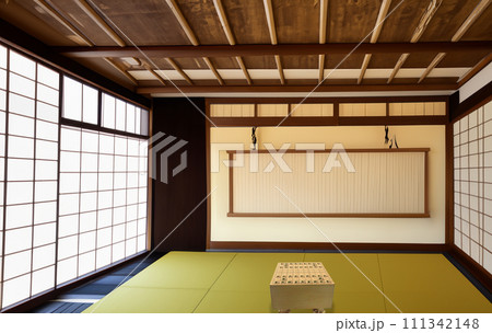 将棋の対局室 無人 将棋盤 駒 AI生成画像 和室 畳 障子 和 和風 文化