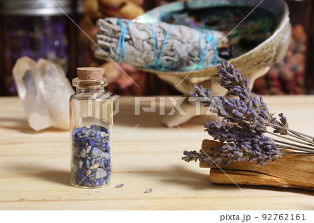 Dried Lavender With Palo Santo Sticks and Abalone Shell For Smudging in Background Shallow DOF