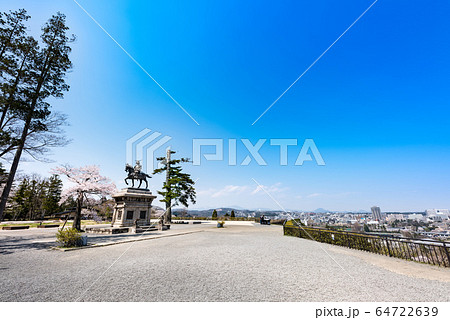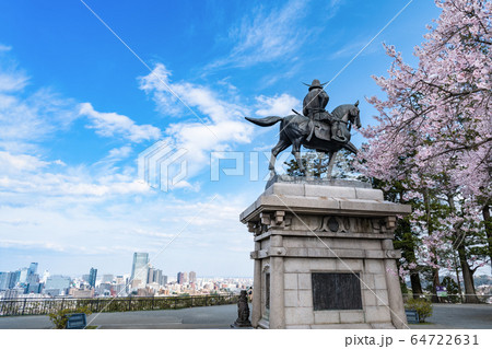 桜と仙台市街を見下ろす伊達政宗像 騎馬像