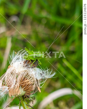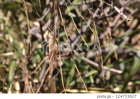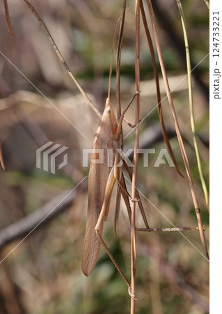 生き物 昆虫 クビキリギス、褐色型の個体。枯れた草むらに溶け込むカモフラージュ
