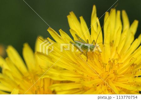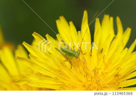 鮮やかな黄色いタンポポの花の上に鎮座するヤブキリの若齢幼虫(自然光+ストロボ、マクロ接写撮影)