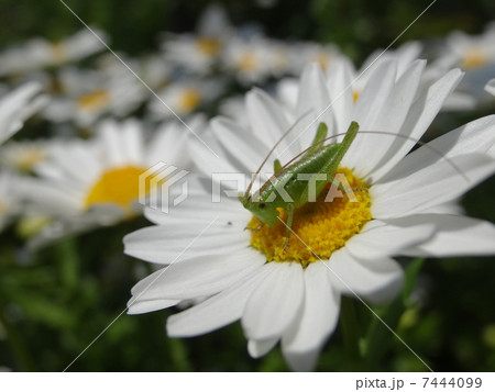 ヒメジオンの花の上で戯れるキリギリスの赤ちゃん