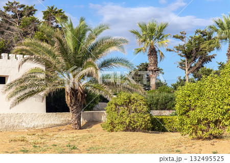 Tropical garden with palm trees and sky