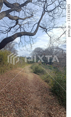 冬、葉の落ちた枝をくぐる枯れ葉の峠の小道