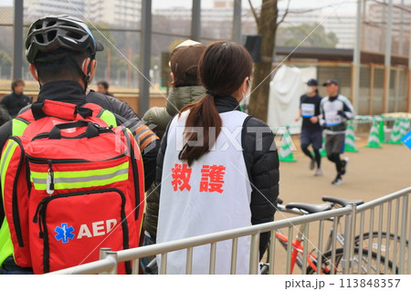 マラソン大会の救護スタッフ AEDを装備して待機するスタッフ