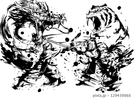 剣道の試合(龍虎のオーラ)の墨絵イラスト