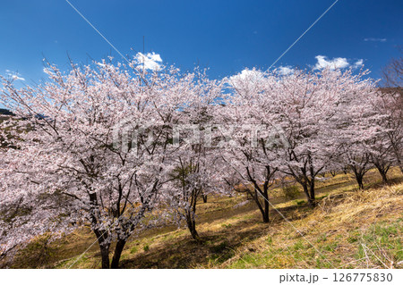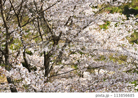 埼玉県秩父郡東秩父村坂本 山一面を桜が覆う「虎山の千本桜」麓から見上げる満開のソメイヨシノ並木