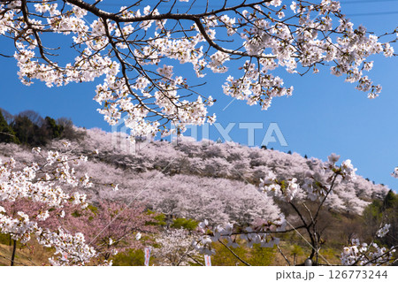 埼玉県秩父郡東秩父村坂本 山一面を桜が覆う「虎山の千本桜」ベニシダレ桜と満開のソメイヨシノ並木