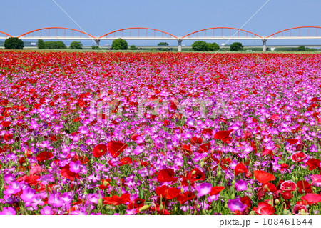 埼玉県鴻巣市吹上 コスモスアリーナ前の荒川河川敷に広がるシャーレーポピーとムギナデシコ畑と水道橋