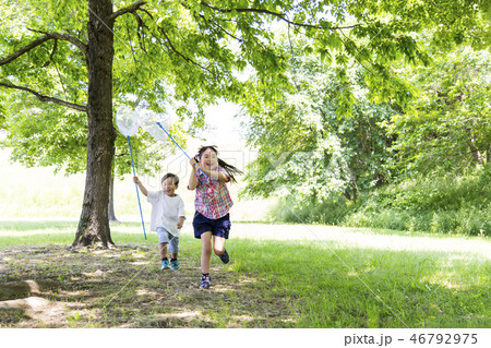 虫取り網を持ち笑顔で虫を追いかける子供2人